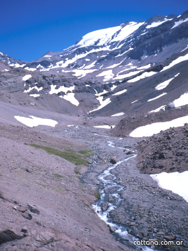 El camino continua ascendiendo al lado de una caída de agua y luego por la margen del río Piedra Numerada hasta alcanzar el Refugio Federación lugar donde se establece el campo base. Existen otros lugares de acampe como La Hoya, poco recomendable, o Los Espejos (lugar donde existen dos pequeñas lagunas) el destruido Refugio de Agostini ubicado al pie de los acarreo del Plomo.-
