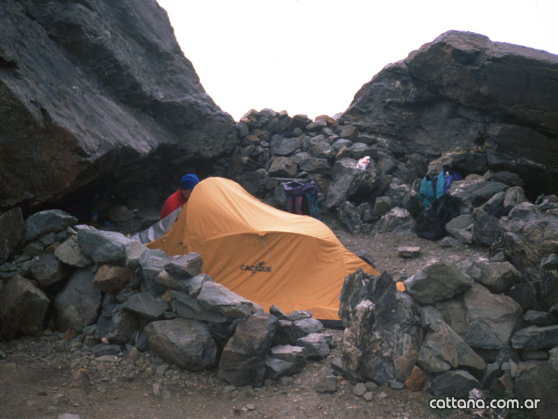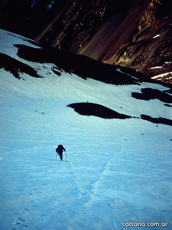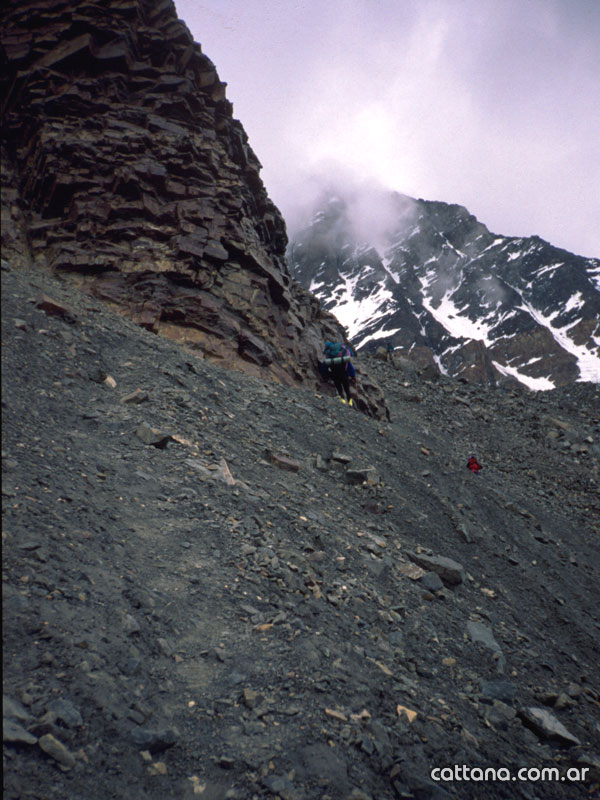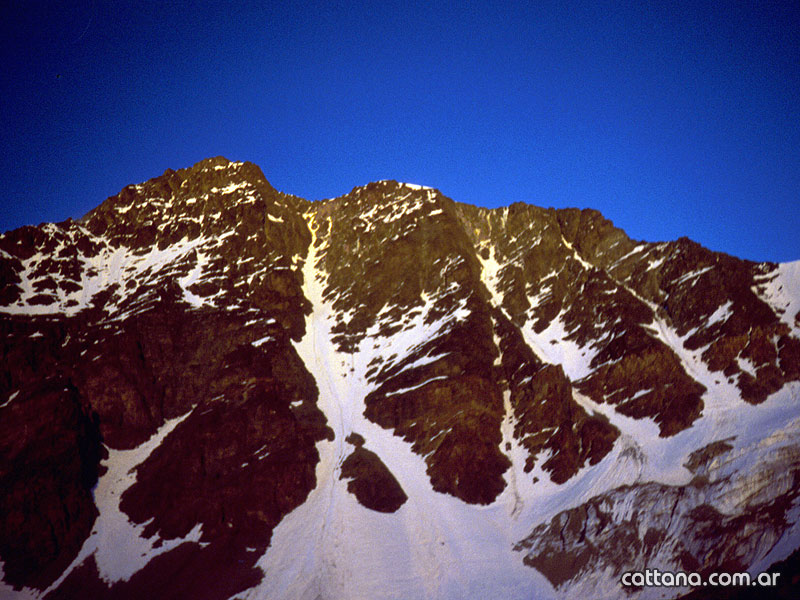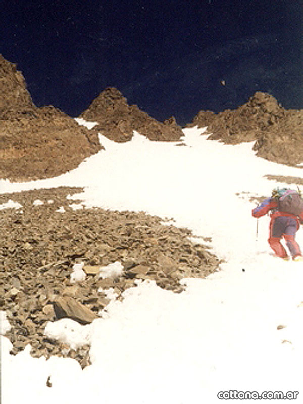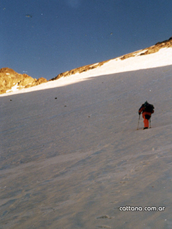 El camino comienza desde el centro de sky. Se monta generalmente un primer campamento en el lugar denominado “Las Veguitas” a una altura de 3.200 m.s.n.m., a orillas de un pequeño curso de agua, o un poco más arriba en “Piedra Grande” a una altura de 3.550 m.s.n.m., aunque en este lugar no hay agua cerca. El camino continúa por el denominado infiernillo hasta arribar al campo “El salto” ubicado a 4.120 m.s.n.m..Este campamento se utiliza como base para ascender, entre otros, Plata, Vallecitos y Rincón. Desde el Campo el salto se debe tomar en dirección Norte y Luego Nor-Oeste. Se arriba a un plateau que se atraviesa por el lado izquierdo hasta la base de la canaleta la que conduce al glaciar superior. De allí a la cima es un largo camino. El descenso es por la misma ruta.-