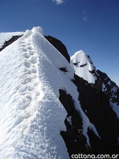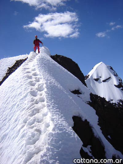 Desde el campo base, a una altura de 4.660 m.s.n.m., a orillas de la laguna Chiar Kota, se debe continuar hasta el final del valle para acceder al glaciar que desciende desde el Tarija (1 -2 horas hasta el Glaciar).Se asciende primero sobre hielo (entrada al glaciar) y luego sobre nieve dura, la pendiente en general no supera los 40° y, en ocasiones, se cruzan algunas grietas de menos de 1 metro de ancho. El trayecto, avanzada la temporada se encuentra muy marcado, asciende por la margen izquierda del glaciar hasta el filo que separa el Huallomen y el Tarija, en este lugar tomar a la derecha y ascender el filo cumbrero de una inclinación de 40° / 45° (2 / 3 horas). Desde la cumbre del Tarija se observa la pirámide del Pequeño Alpamayo. El descenso es por la misma ruta.-